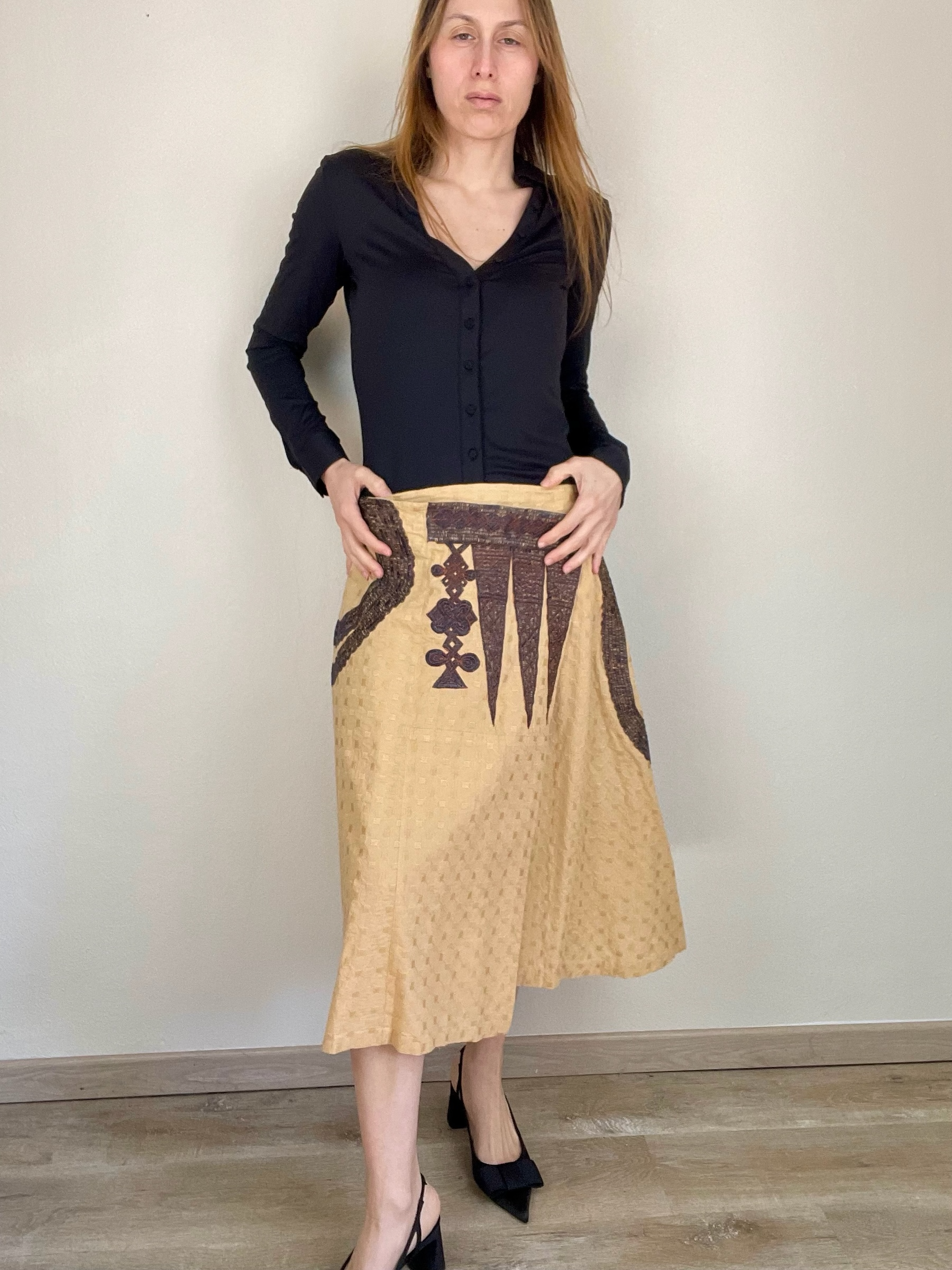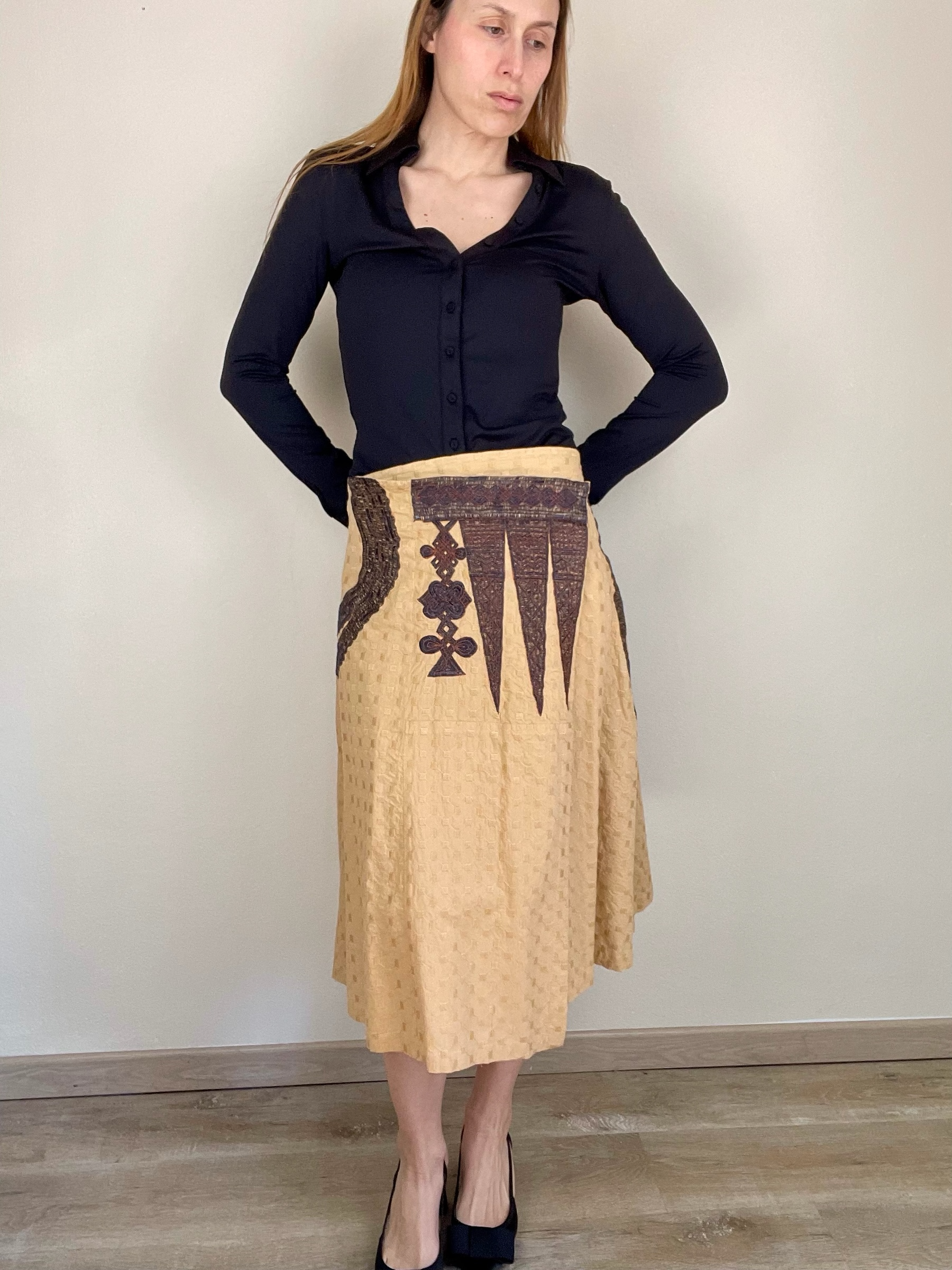 Dries Van Noten Spring Summer 2003 beige/yellow with black embroidery wrap asymmetrical skirt